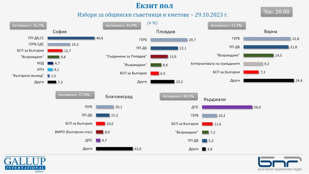 Данни от екзитпол на "Галъп интернешънъл" за изборите за Столичен общински съвет към 20 ч.:
