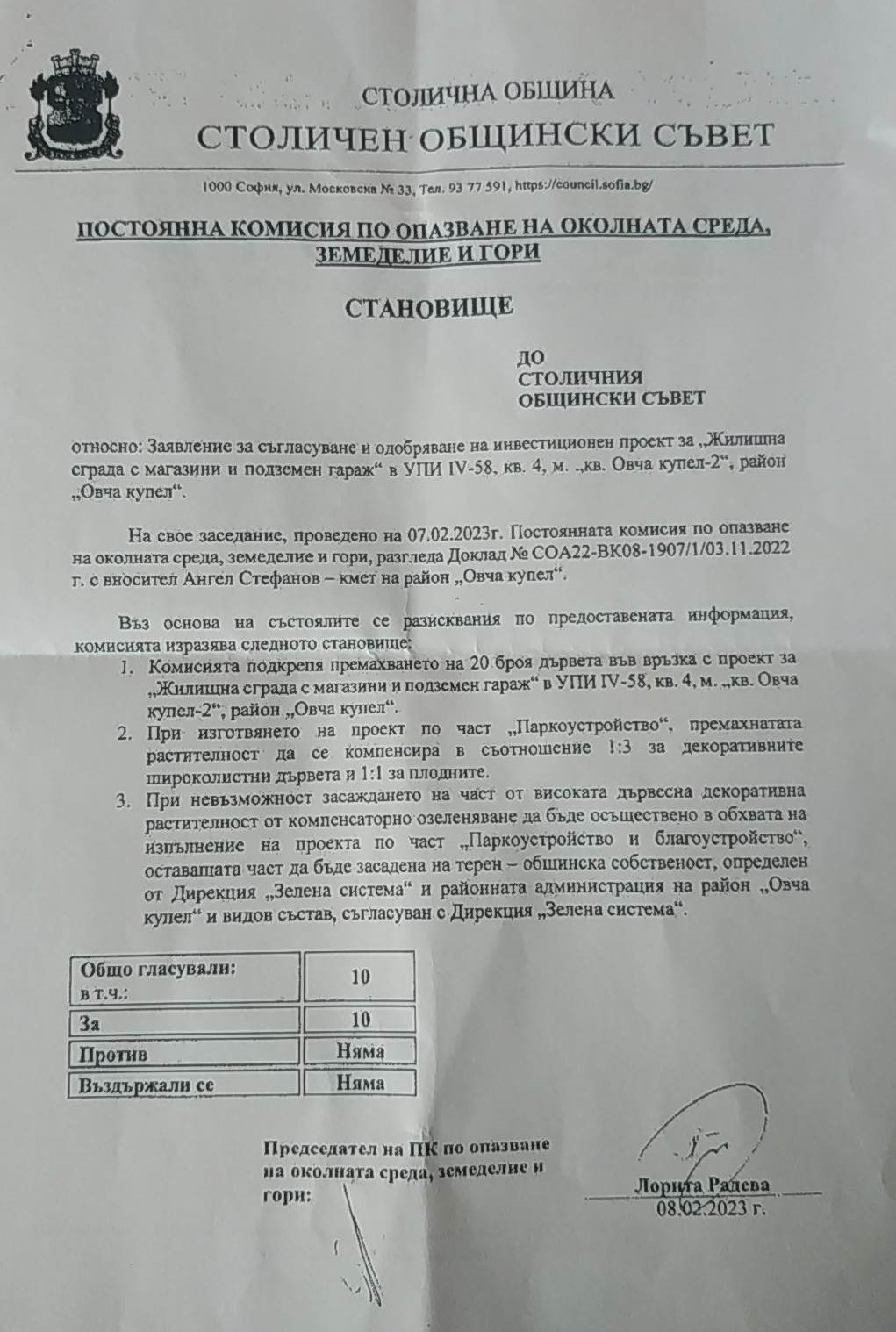Още през февруари Комисия по опазване на околната среда, земеделие и гори е изпратила становище до Столичния общински съвет за дадено съгласие, че Комисията подкрепя премахването на 20 броя дървета във връзка с проект за „Жилищна сграда с магазини и подземен гараж“.