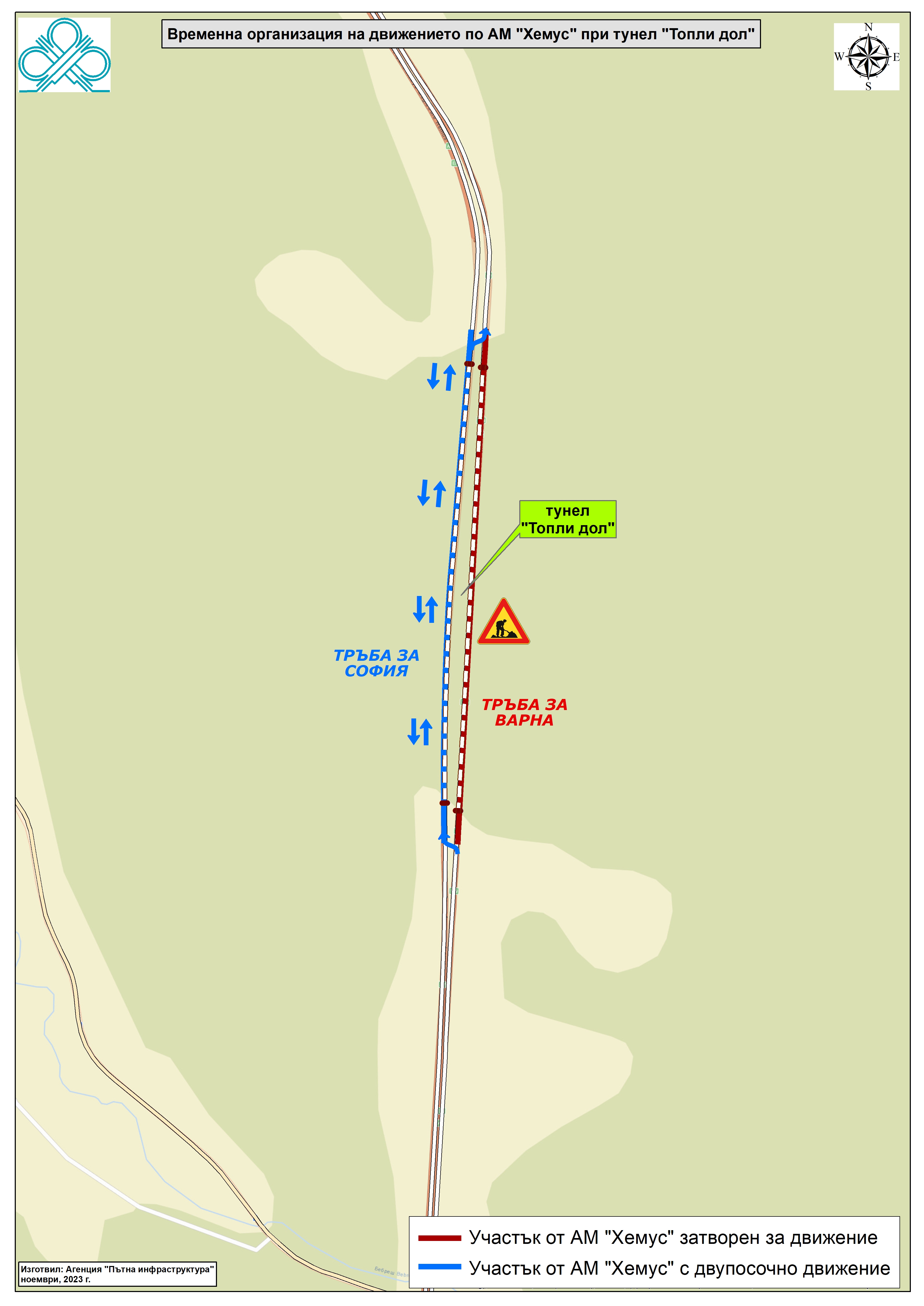 От 8 ноември започва основен ремонт и ще се ограничи движението в тръбите в посока Варна на тунелите „Топли дол“ и „Правешки ханове“ на АМ „Хемус“. При изпълнението на строителните дейности движението ще се осъществява двупосочно в тръбите за София на двата тунела. Планира се ремонтът да продължи до юли догодина, когато ще се възстанови движението през тях и ще започне обновяването на тръбите в посока София.