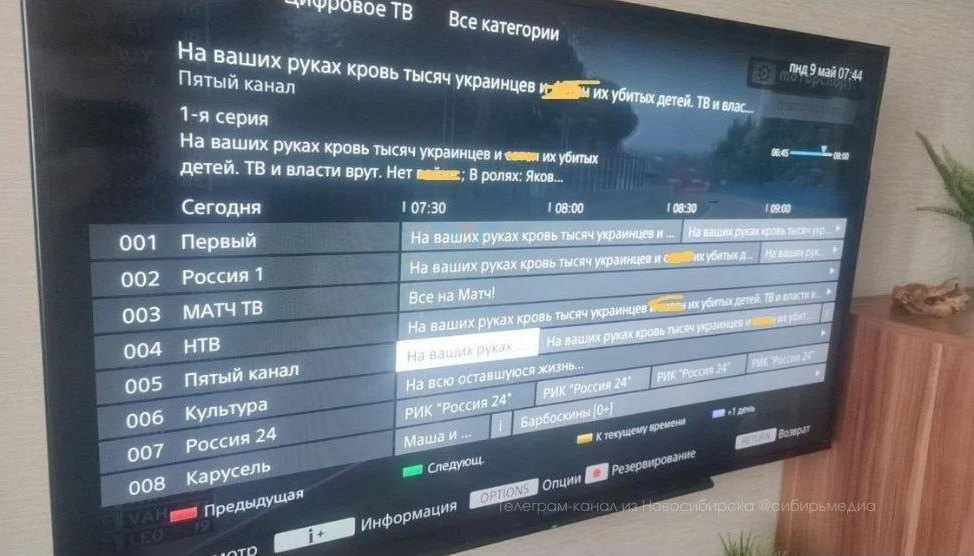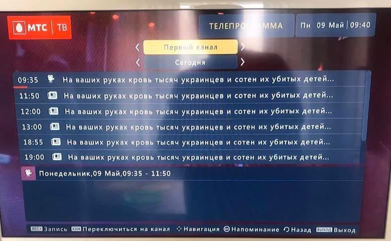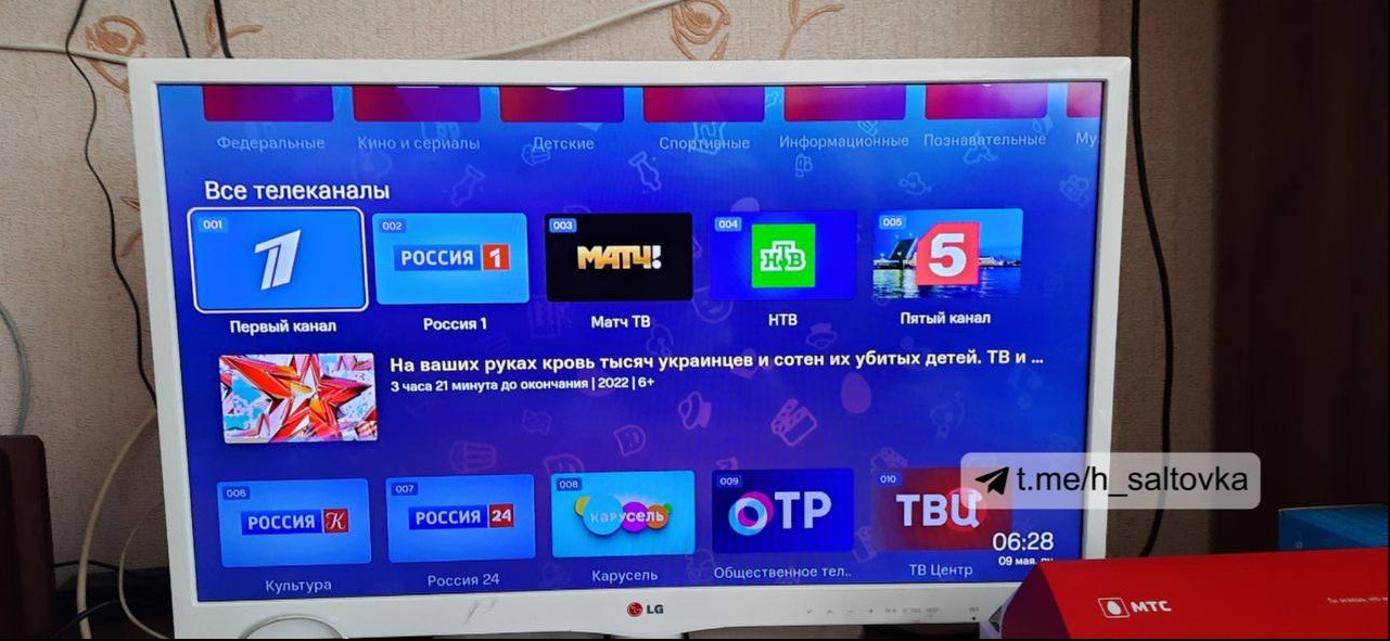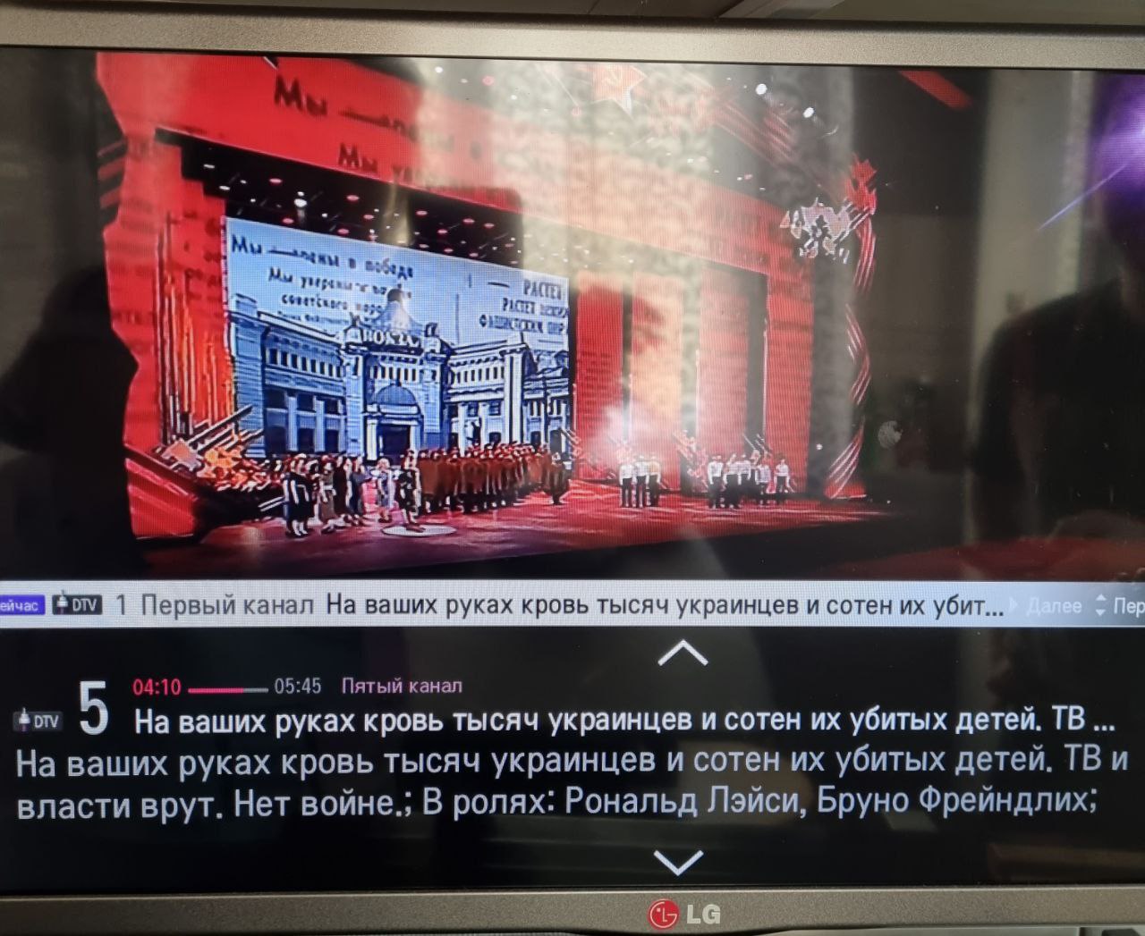 На екранните менюта се виждат надписът „Кръвта на хиляди украинци и стотици техни деца е върху ръцете ви. Телевизията и властите лъжат. Не на войната".