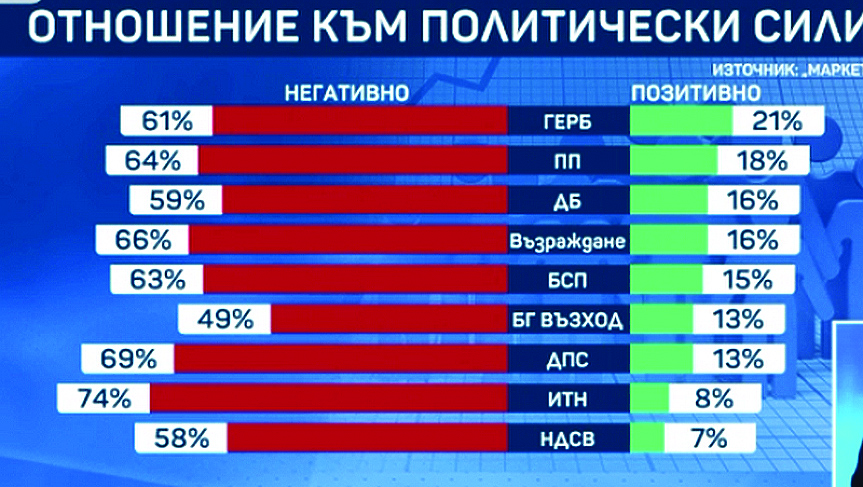 Според анализа на “Маркет линкс” политическите процеси през последните месеци са причина основните играчи на политическата сцена да загубят доверие и да търпят негативно отношение. Въпреки, че всички губят доверие, ГЕРБ, “Продължаваме промяната” и “Демократична България” са формациите, които събират най-голямо позитивно отношение. Най-много негативни нагласи има към “Има такъв народ”, ДПС и “Възраждане”.
