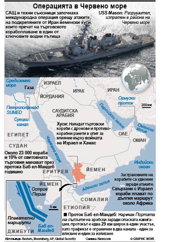 Атаките на хусите през последните седмици нарушиха корабоплаването в Червено море, като редица компании спряха своите кораби да минават по този маршрут от съображения за сигурност.