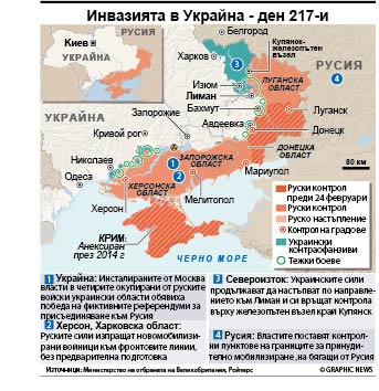 “Уважаеми Владимир Владимирович (...) Моля ви да разгледате въпроса за присъединяването на Луганската народна република към Русия като субект на Руската федерация”, каза проруският сепаратистки лидер на Луганск Леонид Пасечник в текст, публикуван в социалната мрежа “Телеграм”. Подобно послание отпрати и Владимир Салдо, който оглавява окупационната администрация в Херсон (юг).