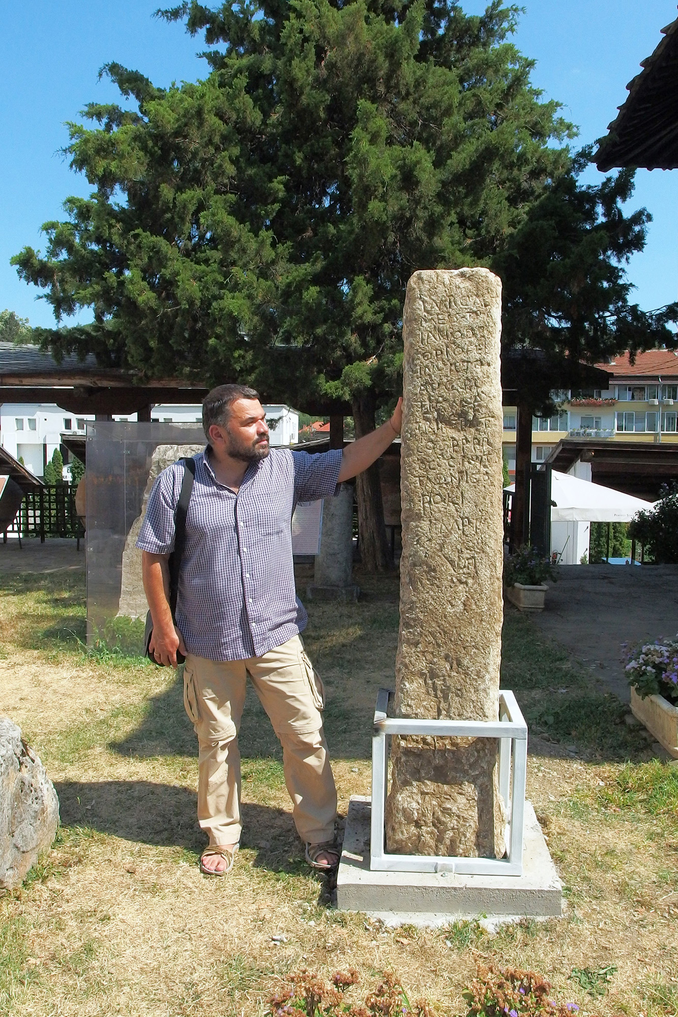 Проф. Иван Христов, ръководител на проучванията, пред новооткритата колона, експонирана в двора на музея в Троян.