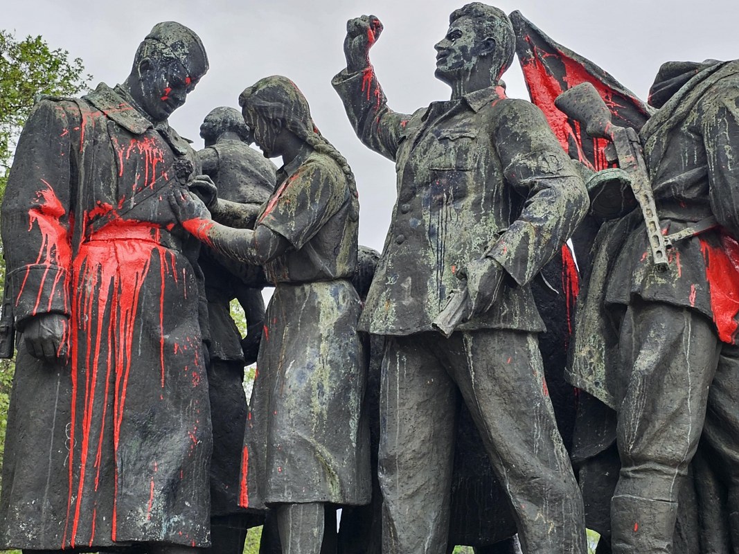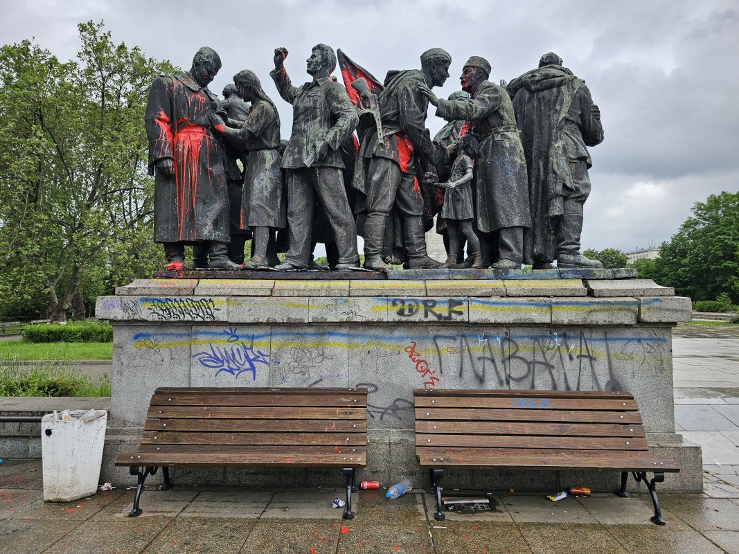 Една от композициите му е залята с червена боя, която е напръскала и пространството около монумента. На централната част на паметника с червени букви е написано - "ДЕМОНТАЖ".