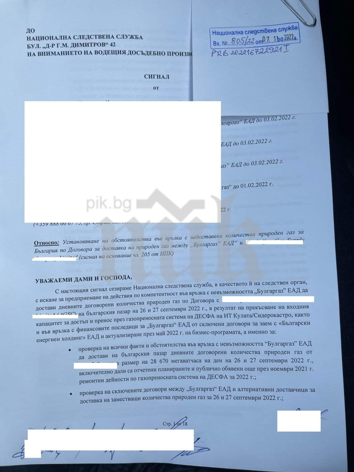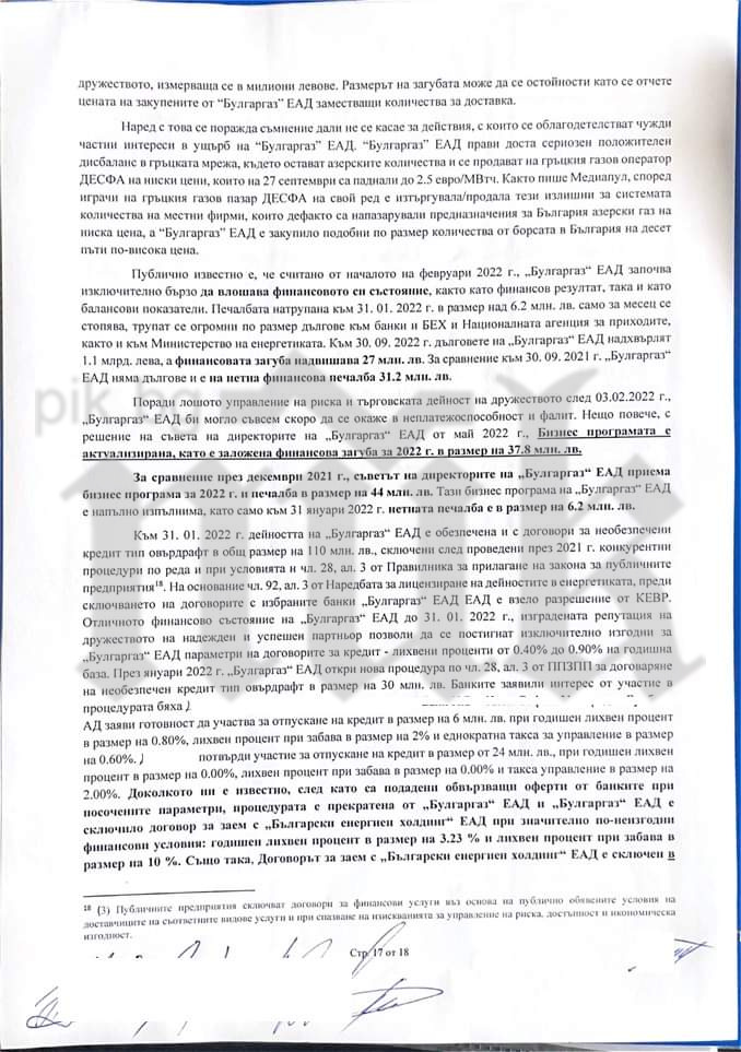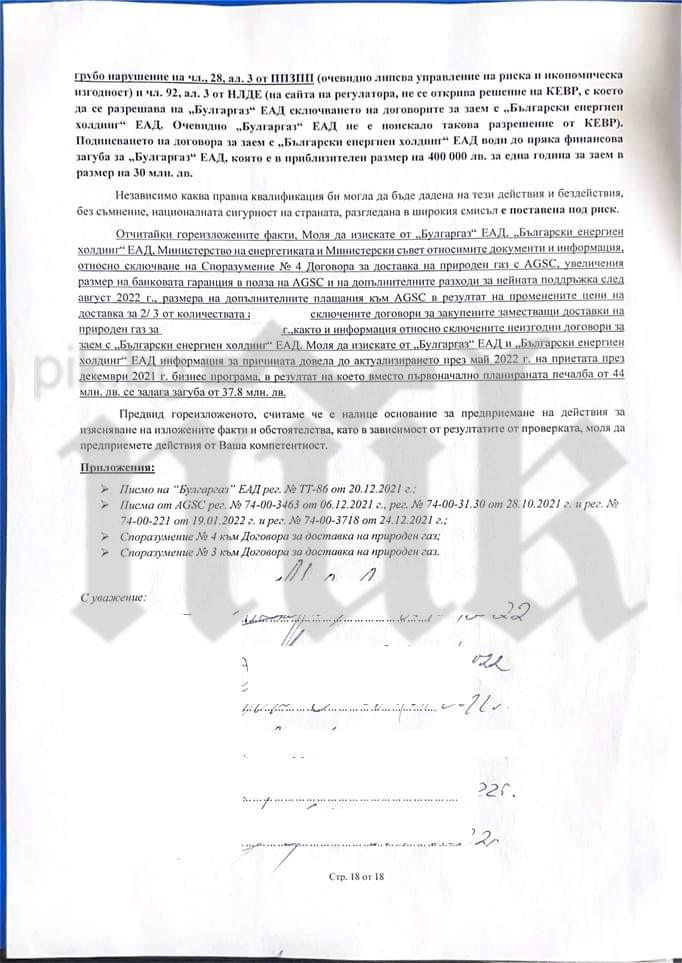 В сигнала е описана детайлно невъзможността „Булгаргаз” ЕАД да достави договорените дневни количества природен газ по договор, сключен от правителството.