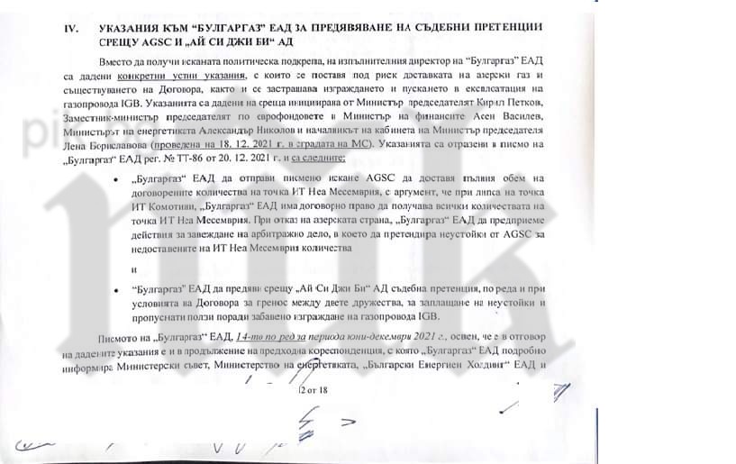 "Едно от най-фрапантните обстоятелства, по които работят разследващите органи, е свидетелството, че на проведена на 18.12.2021 г. среща в сградата на МС министър председателят Кирил Петков, заместник-министър председателят по еврофондовете и министър на финансите Асен Василев, министърът на енергетиката Александър Николов и началникът на кабинета на министър председателя Лена Бориславова са давали конкретни устни указания на изпълнителния директор на “Булгаргаз” ЕАД, с които се поставя под риск доставката на газ и съществуването на договорите, както и се застрашава изграждането и пускането в експлоатация на газопровода IGB", пише ПИК.