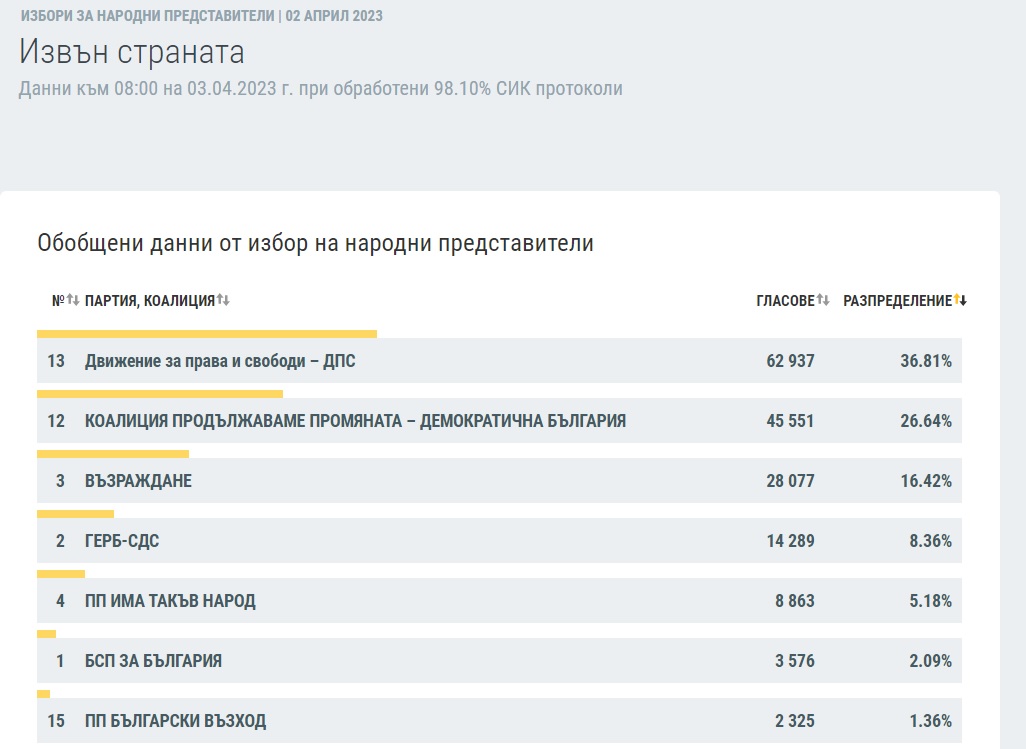 Гласовете зад граница се обработват по-бързо от тези в страната. Към 8 ч. са готови над 98.10% от протоколите. ДПС, ПП-ДБ и "Възраждане" са партиите, ползващи се с най-висока подкрепа от чужбина - съответно 36,81%, 26,64% и 16,42%.