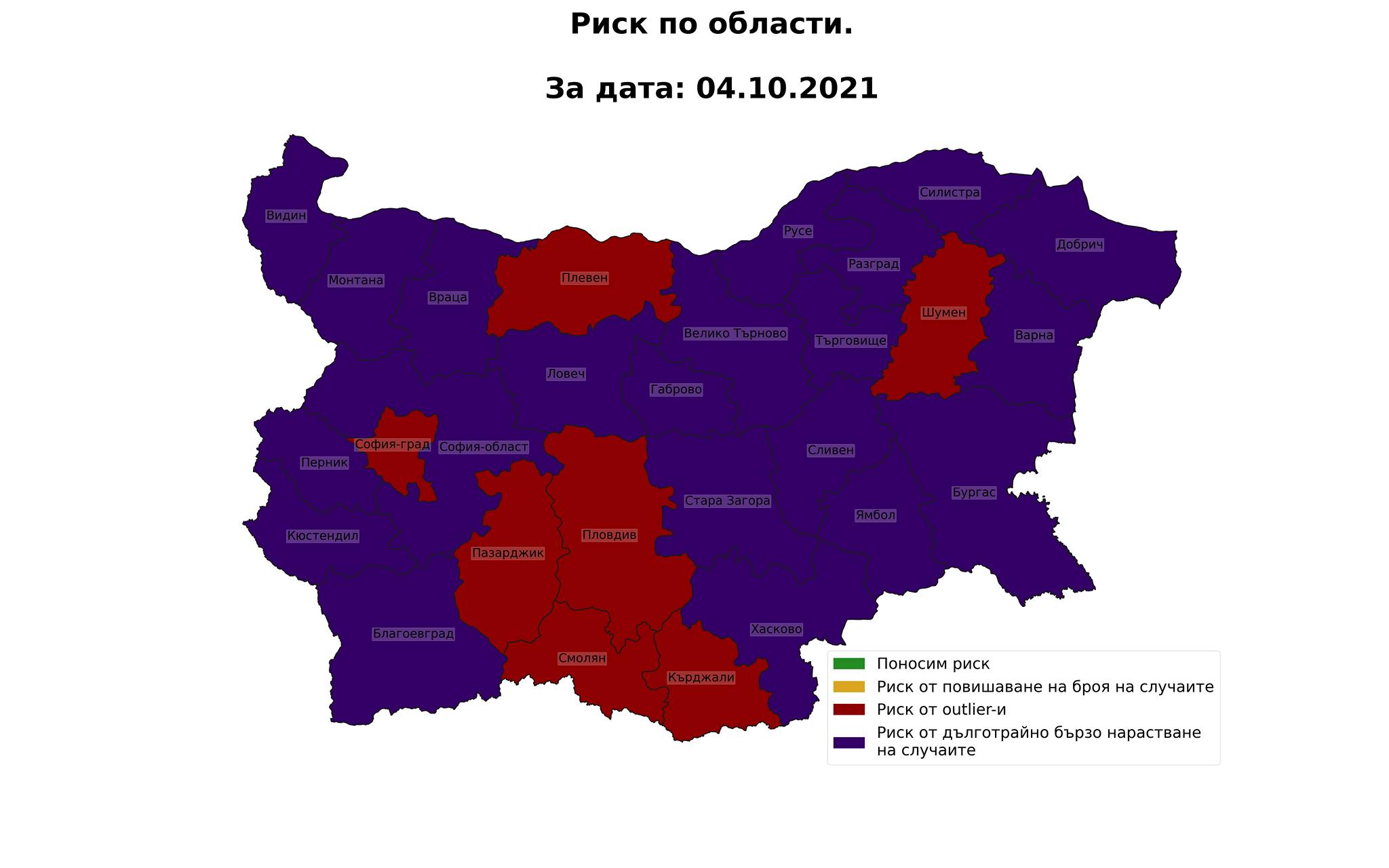 Най-напред картата съгласно плана на Министерството на здравеопазването. Писах, че се очаква появата на области на ниво 4. Първата вече я коментирахме - Габрово. След това дойде Перник, а в края на миналата седмица - Видин и Монтана. Гледаме картата днес - тя е прогнозна за сряда. Виждаме, че Видин и Монтана са се върнали на ниво 3. Но това е формално, защото тези карти се правят по регистрираните случаи, а в събота и неделя, тези случаи са по-малко. Реално погледнато, Видин и Монтана са си на ниво 4. Другото интересно, което виждате, е че Кърджали е на ниво 1 - позеленя.