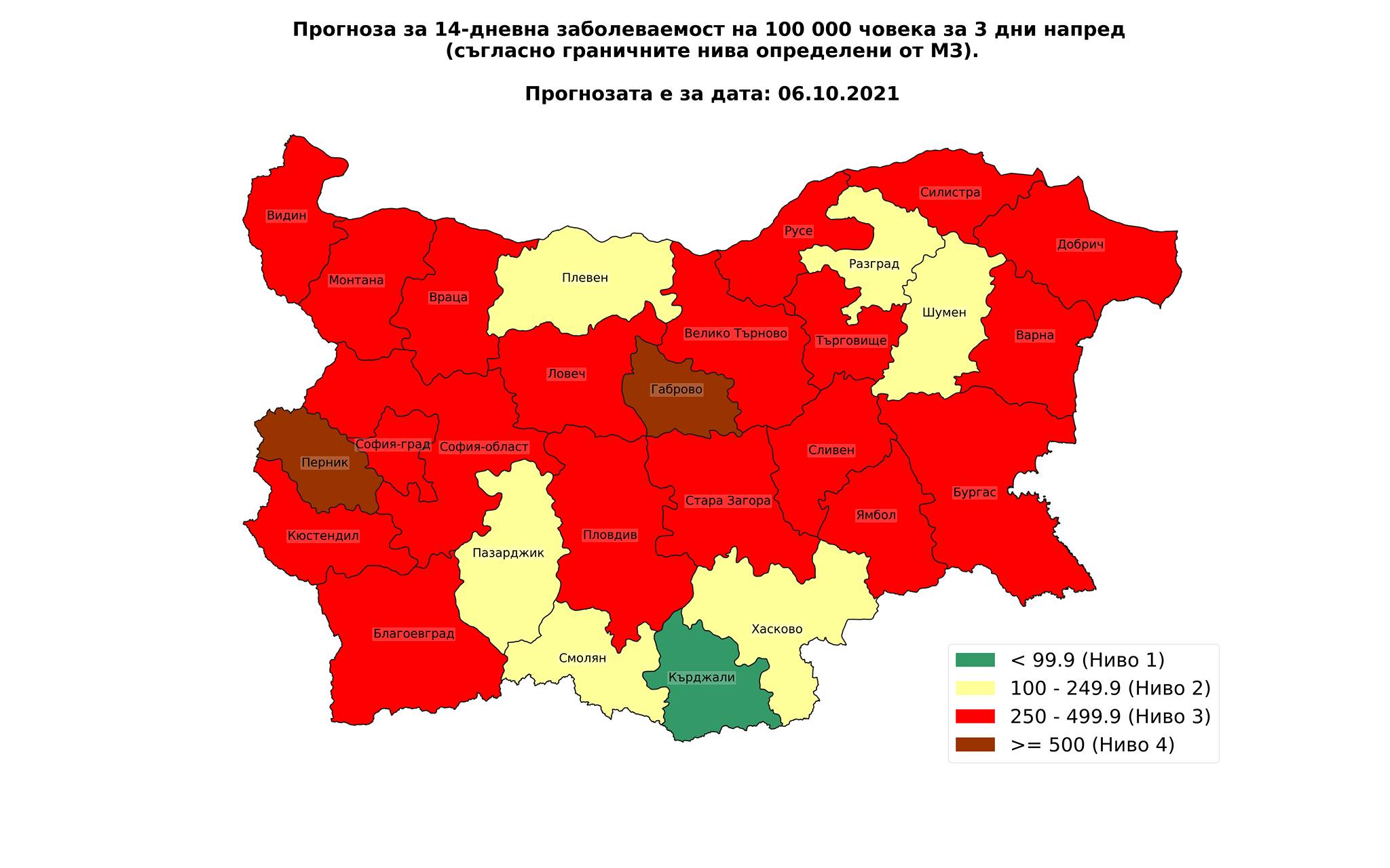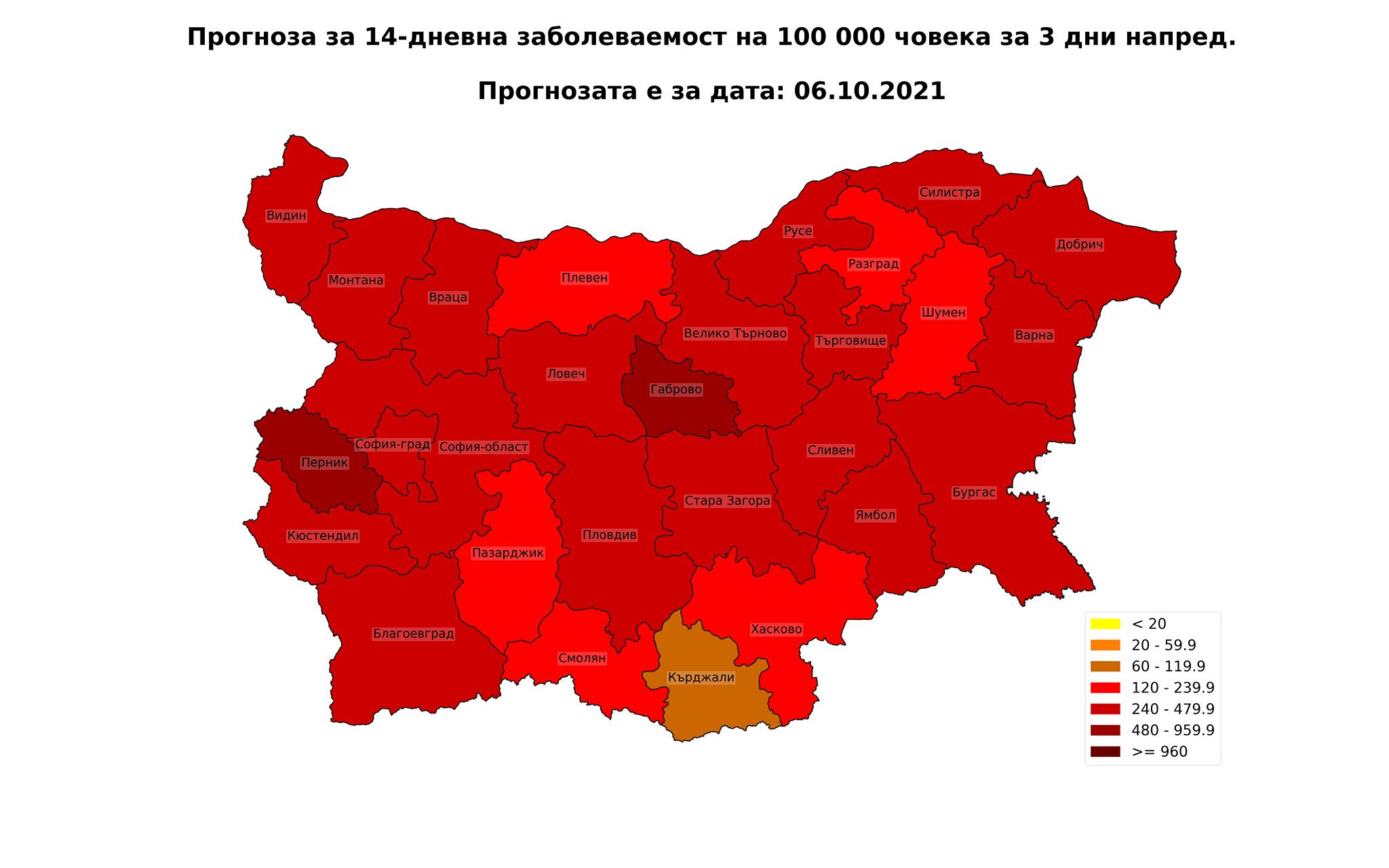 На прогнозната карта за 14-дневната заболеваемост няма особени промени. Кърджали си е в оранжево. В София-град и в Пловдив обстановката бавно се влошава, а в Кърджали - бавно се подобрява.