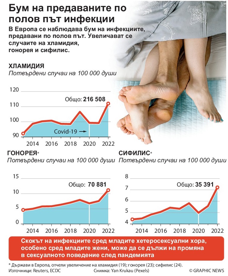 Инфекциите, предавани по полов път, са се увеличили в цяла Европа през 2022 г., като регистрираните случаи на гонорея са скочили почти наполовина, предаде Ройтерс, позовавайки се на най-новите данни, публикувани от Европейския център за профилактика и контрол върху заболяванията (ECDC).
