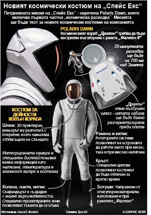 Членовете на екипажа, сред които е милиардерът Джаред Айзъкман, ще облекат новите тънки скафандри на “Спейс Екс” в транспортната капсула “Дракон”, модифицирана така, че да може да отваря вратата на люка си в космическия вакуум - необичаен процес, който премахва необходимостта от въздушен шлюз.