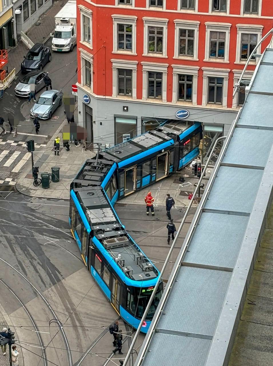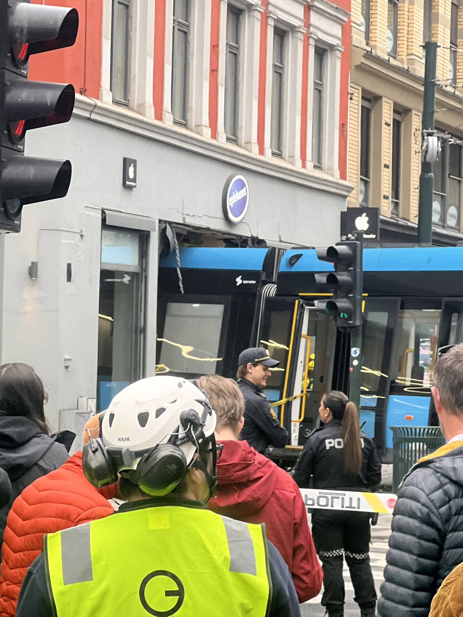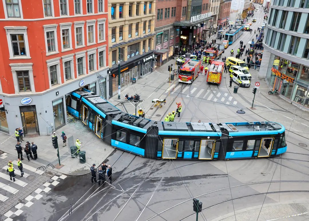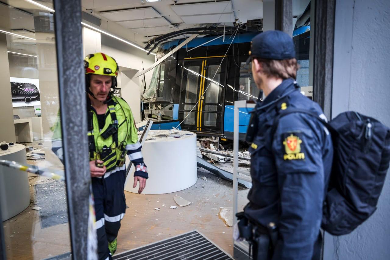 Снимки от мястото на произшествието, публикувани от норвежките медии, показват син трамвай, който се е врязал в магазин за компютри в центъра на Осло. В магазина са нанесени много щети, съобщи полицията.