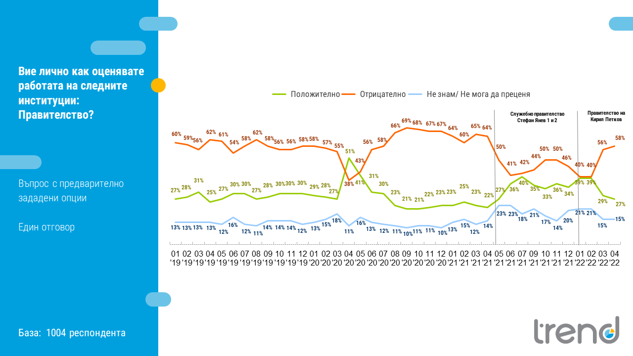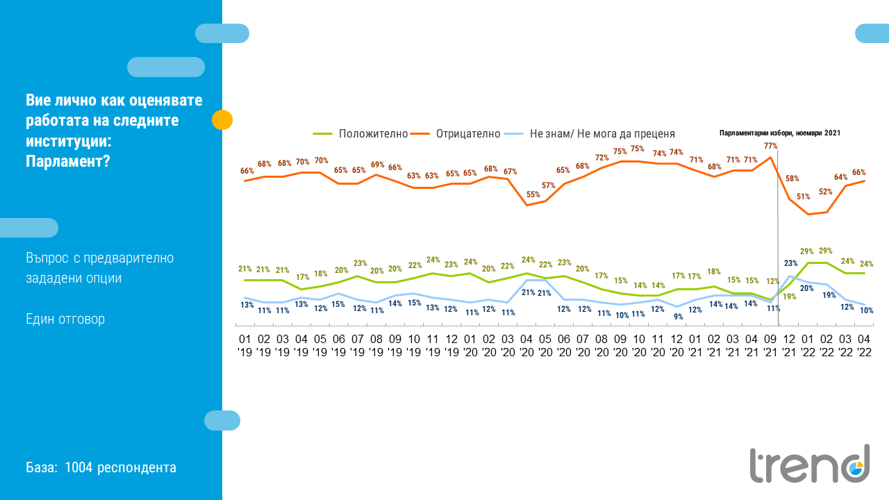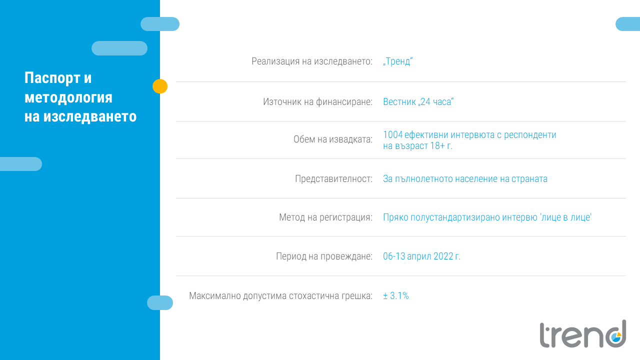 „Продължаваме промяната“ бележи нов спад в подкрепата, което позволява ГЕРБ да ги изпревари. „Възраждане“ регистрира ръст за втори пореден месец. Над половината българи са на мнение, че правителството няма да изкара пълен мандат. 47% са на мнение, че не сa необходими предсрочни парламентарни избори. Проучването е по поръчка на вестник "24 часа" на Изследователски център „Тренд”. В изследването са направени 1004 интервюта с българи над 18 години за периода 06-13 април 2022 г.
