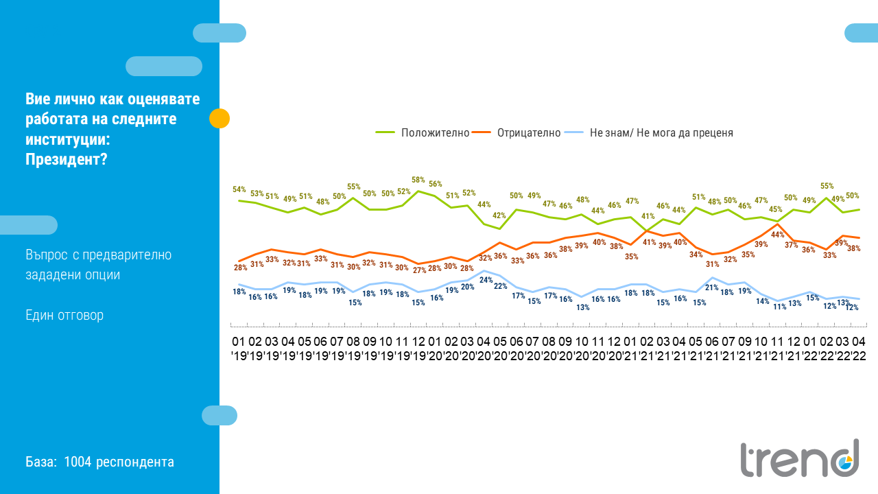 При президента не се наблюдава съществена промяна този месец, като положителните оценки за неговата работа са 50%, а отрицателни 38%.