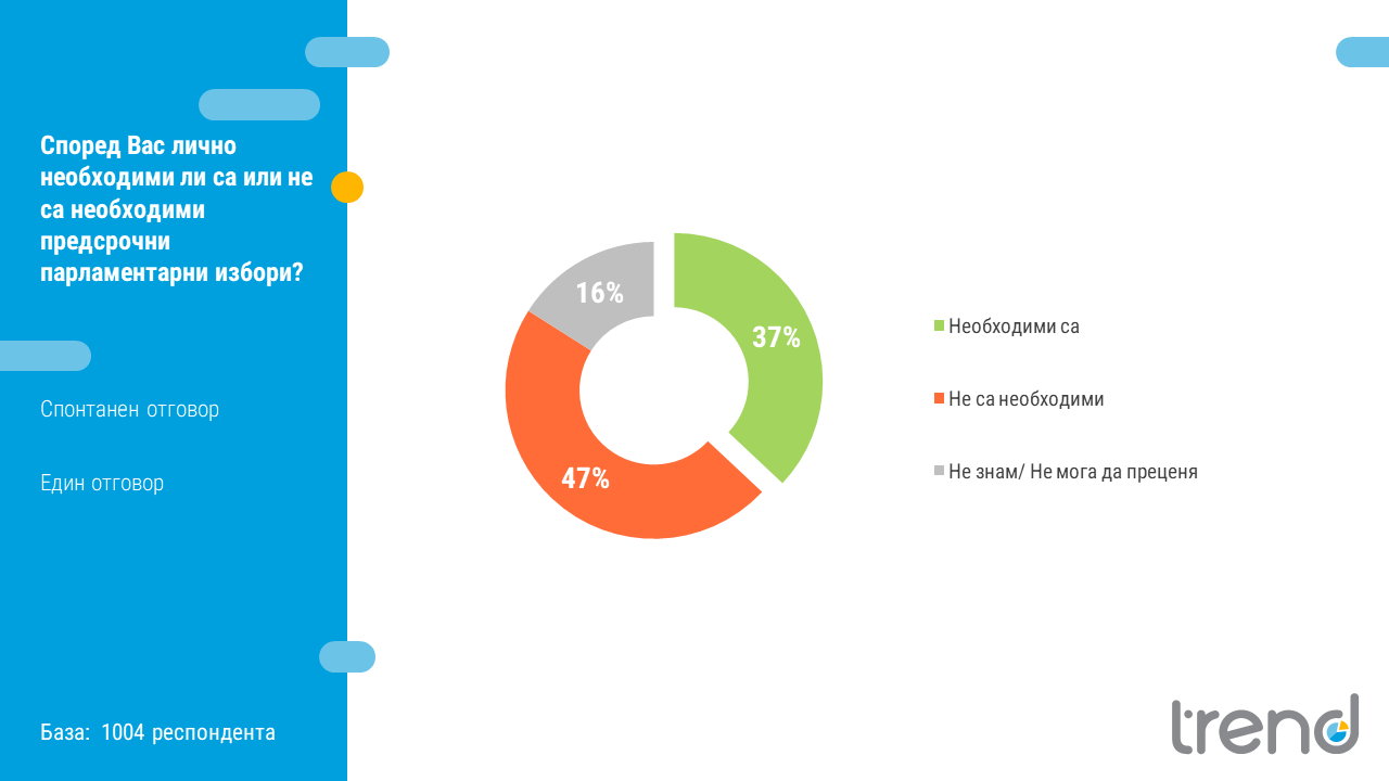 Близо половината българи (47%) са на мнение, че предсрочни парламентарни избори не сa необходими. 37% са на обратното мнение. Сред разбивките по групи прави впечатление, че единствено сред симпатизантите на ГЕРБ и Възраждане доминира позицията, че са необходими предсрочни парламентарни избори.