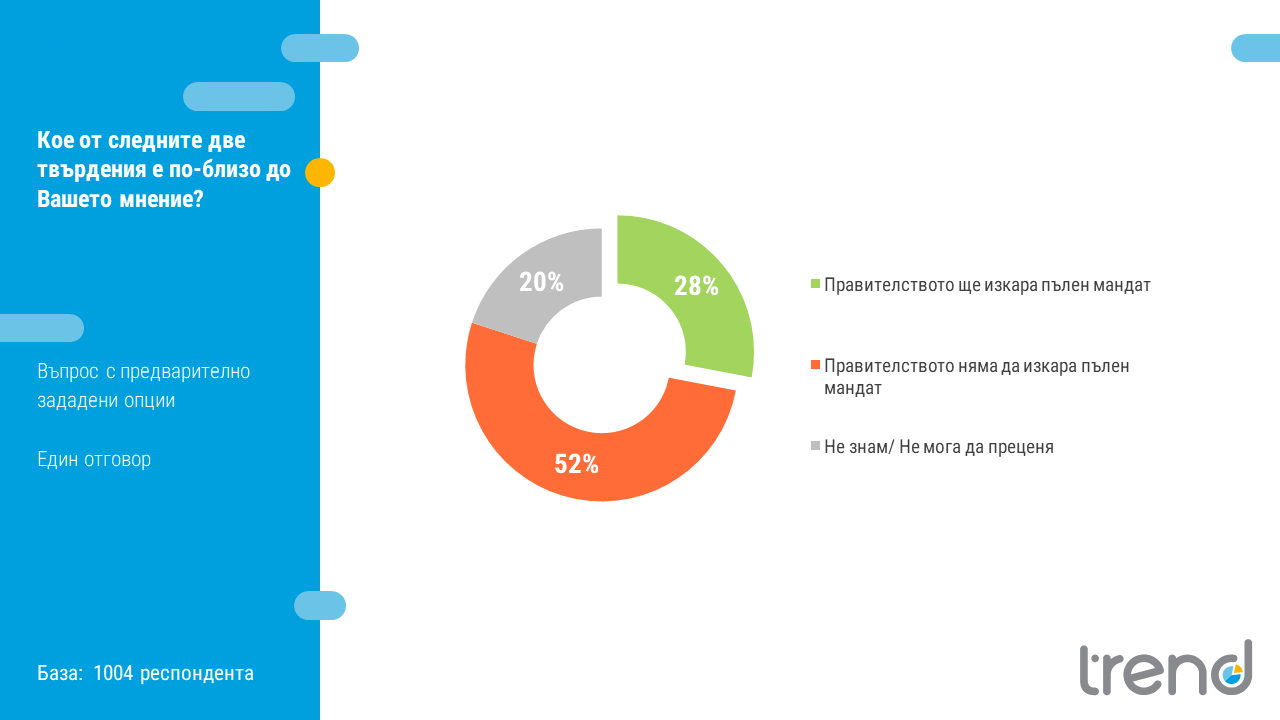 Малко над половината (52%) смятат, че правителството няма да изкара пълен мандат. 28% са на противоположното мнение.