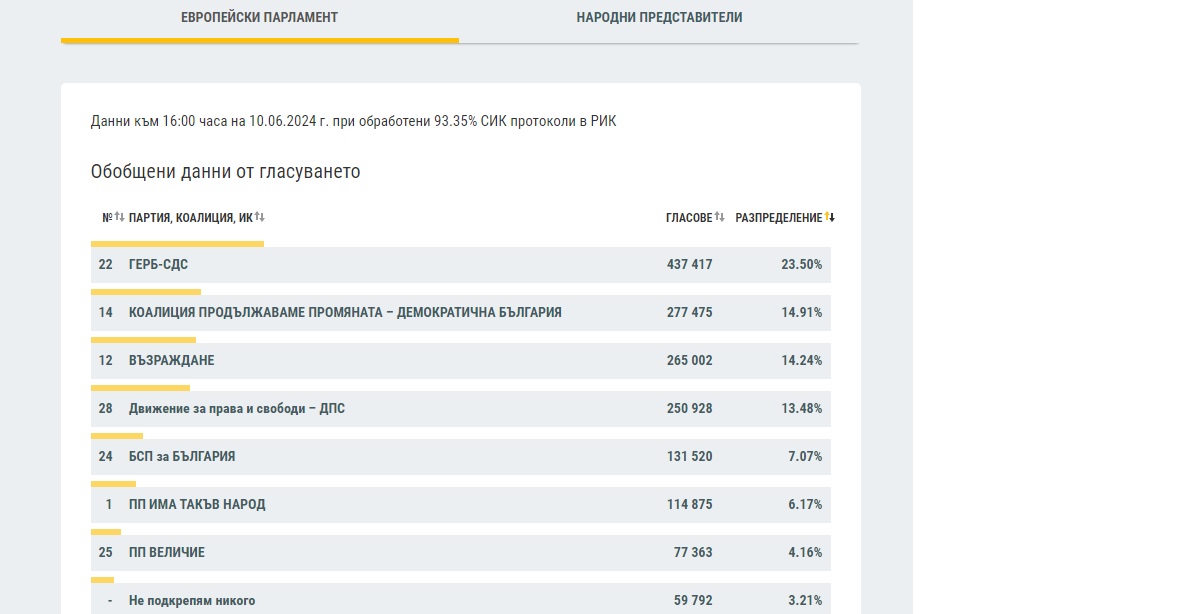 Това показват данните, публикувани от ЦИК към 16.00 часа при обработени в районните избирателни комисии 93.53% от протоколите на секционните избирателни комисии.