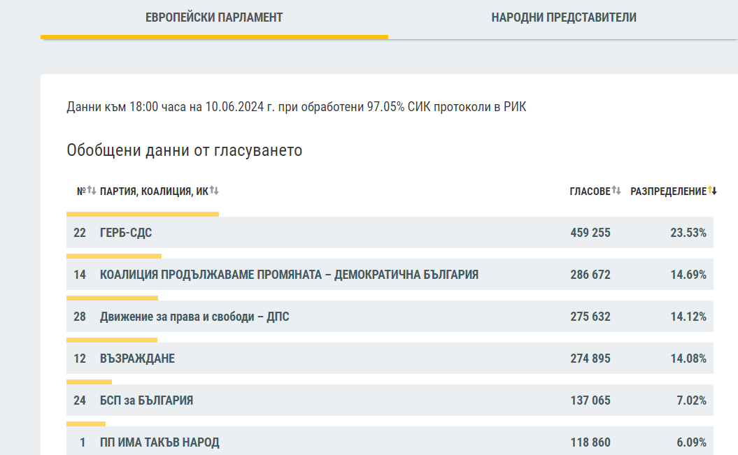 Това показват данните, публикувани от ЦИК към 18.00 часа при обработени в районните избирателни комисии 97.03% от протоколите на секционните избирателни комисии.