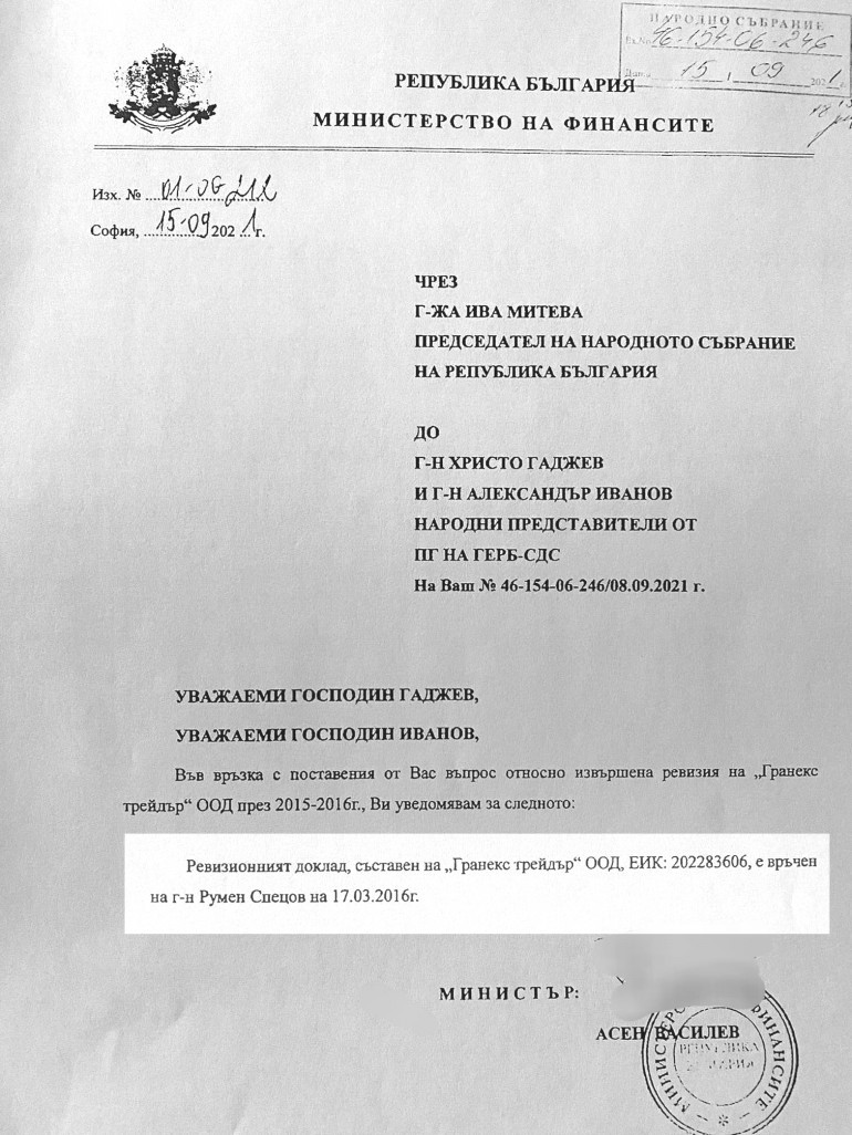 “Г-н Румен Спецов на 17 март 2016 г. е получил и подписал ревизионния акт на фирмата “Гранекс Трейдър”, посочи Гаджев.